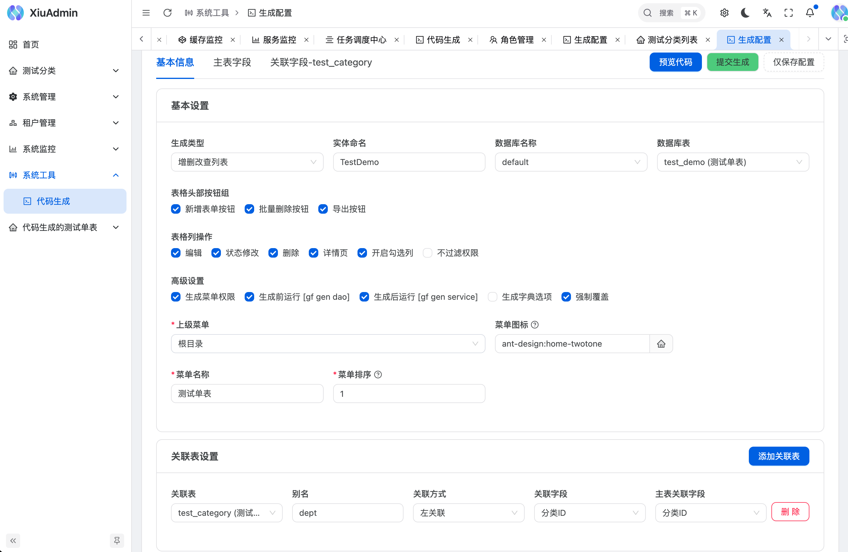 在生成CURD时,如果需要生成关联表,可以在生成配置页面中选择关联表,并填写关联表的配置信息。