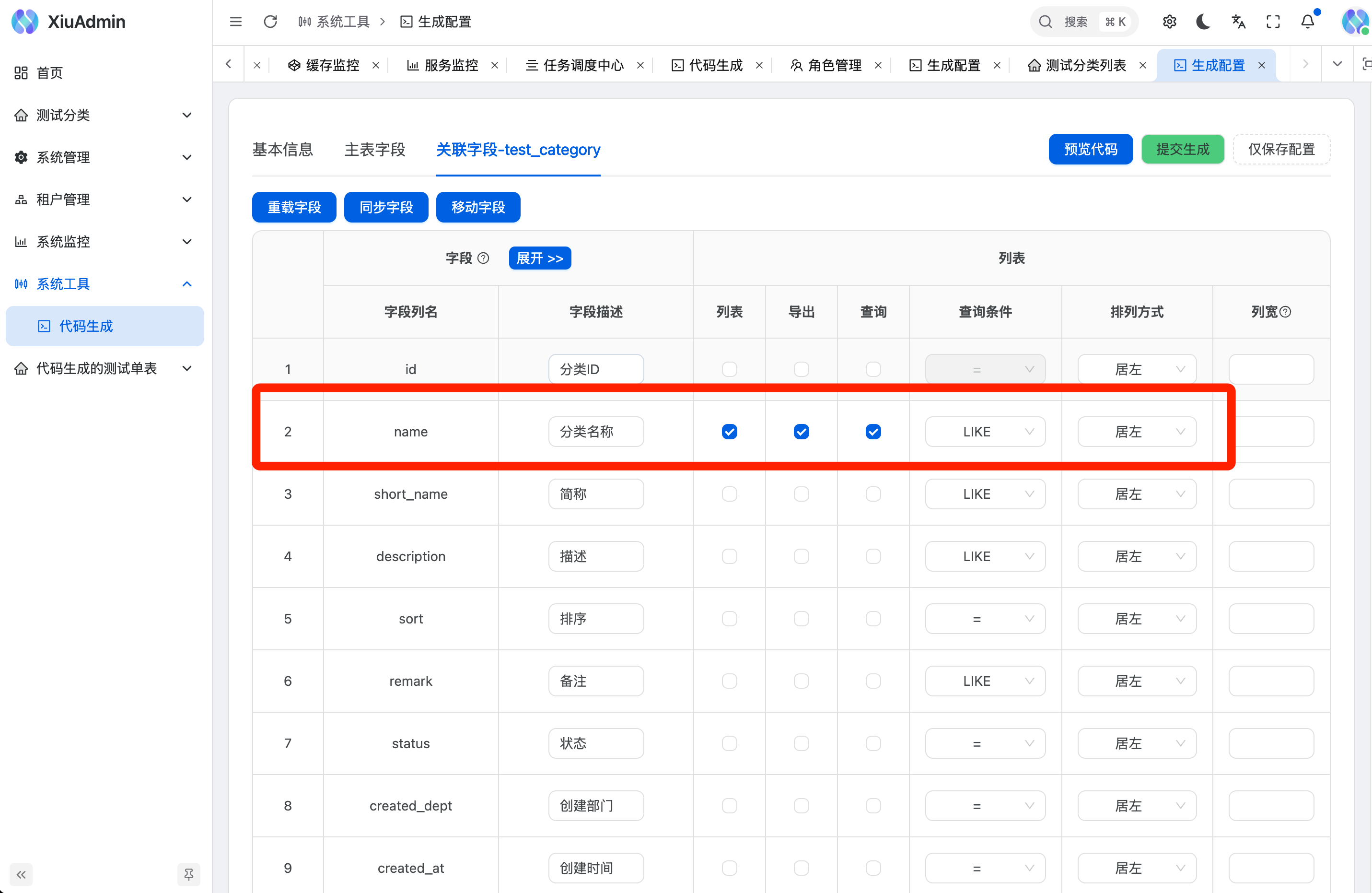 在该页面你可以调整生成表格关联表字段名称、列表展示/查询项、字段排序、重置和同步字段